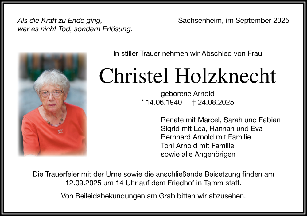 Hier finden Sie alle Traueranzeigen aus der Zeitung, die bisher für Christel Holzknecht erschienen sind. Weitere Traueranzeigen, die in der Zeitung erscheinen, werden hier ebenfalls aufgelistet