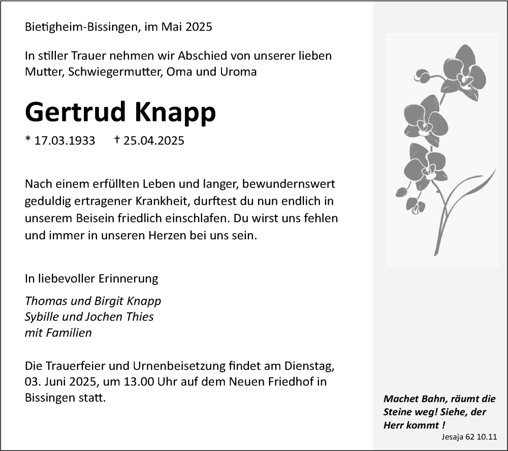 Hier finden Sie alle Traueranzeigen aus der Zeitung, die bisher für Gertrud Knapp erschienen sind. Weitere Traueranzeigen, die in der Zeitung erscheinen, werden hier ebenfalls aufgelistet