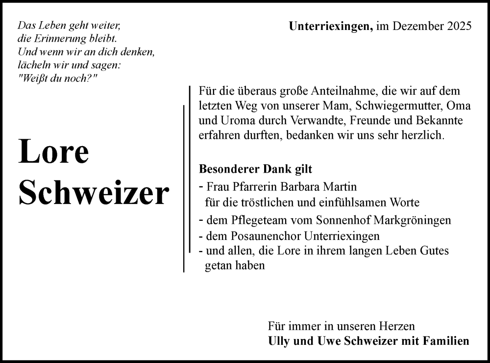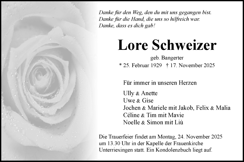 Hier finden Sie alle Traueranzeigen aus der Zeitung, die bisher für Lore Schweizer erschienen sind. Weitere Traueranzeigen, die in der Zeitung erscheinen, werden hier ebenfalls aufgelistet