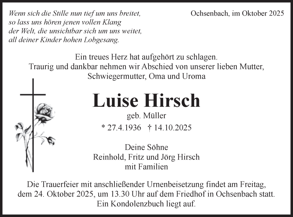 Hier finden Sie alle Traueranzeigen aus der Zeitung, die bisher für Luise Hirsch erschienen sind. Weitere Traueranzeigen, die in der Zeitung erscheinen, werden hier ebenfalls aufgelistet