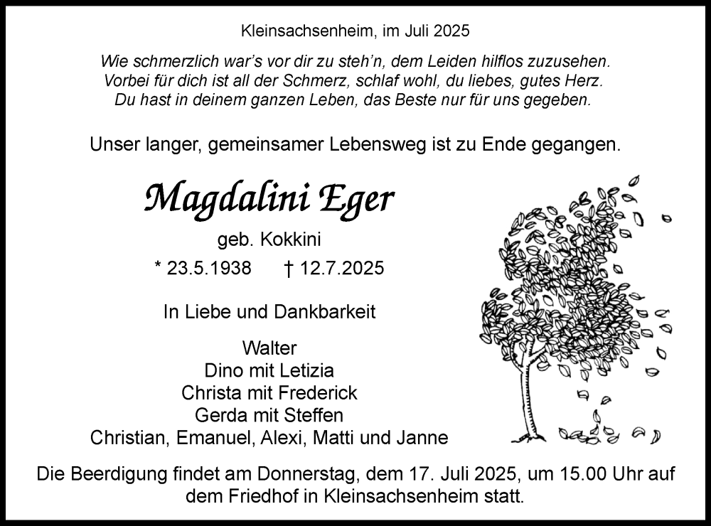 Hier finden Sie alle Traueranzeigen aus der Zeitung, die bisher für Magdalini Eger erschienen sind. Weitere Traueranzeigen, die in der Zeitung erscheinen, werden hier ebenfalls aufgelistet