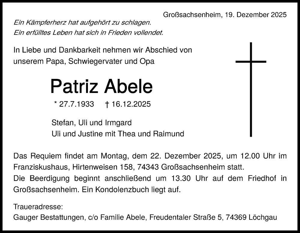 Hier finden Sie alle Traueranzeigen aus der Zeitung, die bisher für Patriz Abele erschienen sind. Weitere Traueranzeigen, die in der Zeitung erscheinen, werden hier ebenfalls aufgelistet